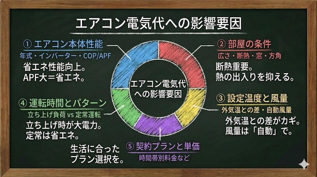 エアコンの電気代は、機械の性能だけでなく、家の環境や使い方にも大きく左右されます。ここでは5つの主要な要素を整理します。