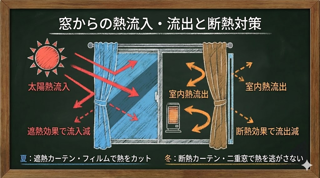 冬場は逆に、窓から熱が逃げるのを防ぐため、断熱カーテンや二重窓が有効です。熱の流れは温度差 × 熱伝導率 × 面積に比例するため、窓の面積が大きいほど対策の効果も大きくなります。