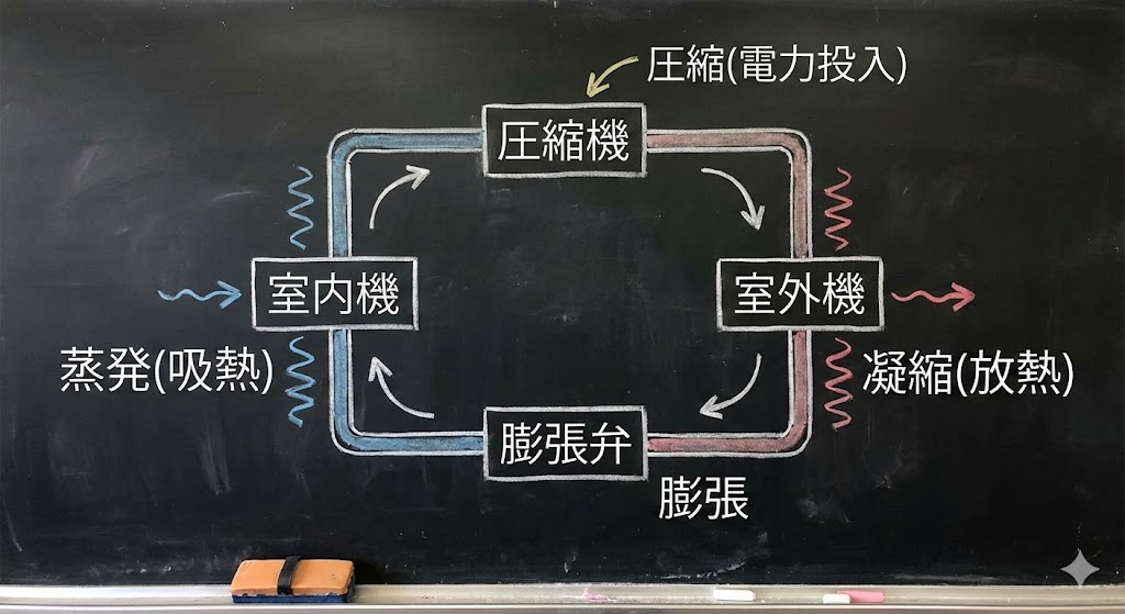 暖房時はこの流れが逆になり、室外の空気から熱を奪って室内に運びます。このサイクルを繰り返すことで、少ない電力で大きな熱移動を実現しています。